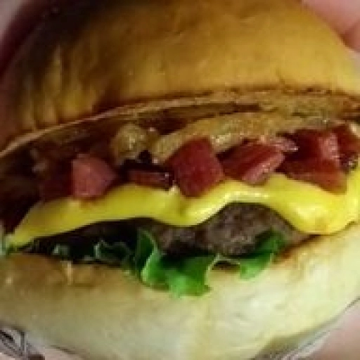 2 Hamburgueres, 2 fatias cheddar , bacon , salada e molho barbecue