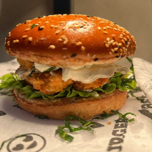 pão brioche , 90g de file de frango empanado, creme cheese e salada.