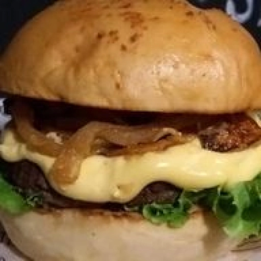 Hambúrguer de carne de 150g, creme cheddar, crocante de cebola, bacon, salada, molho barbecue ou molho da casa.