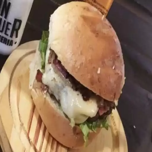 Hambúrguer artesanal de 150g, bacon, cebola crocante, queijo mussarela, salada, molho barbecue ou molho da casa.